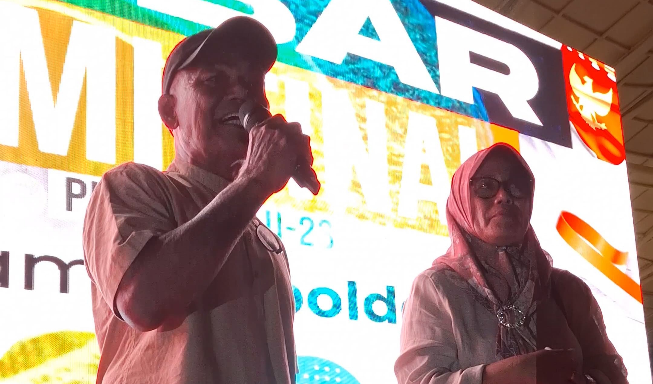 BATAMSTRAITS.COM, BATAM – Ayahanda Ramadhan Sananta, Syahriman mengungkapkan keharuannya saat diminta untuk maju ke atas panggung utama Dataran Engku Puteri, Kota Batam, Provinsi Kepulauan Riau (Kepri). Ia tampak menyapa masyarakat yang ikut Nobar Timnas Indonesia.
