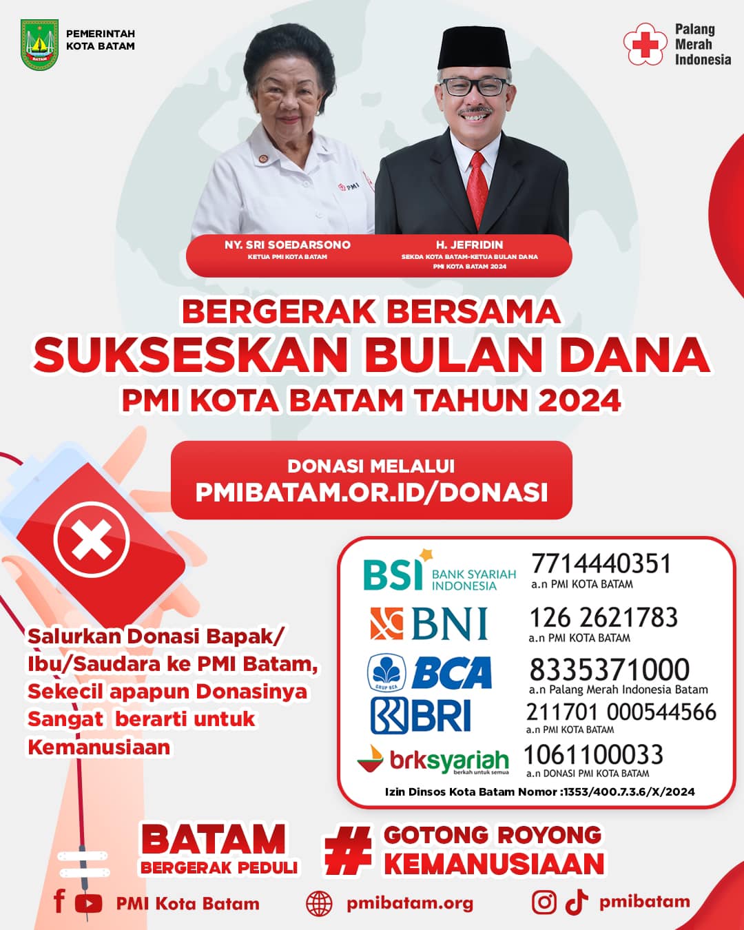 – Bank BCA: 8335371000 (a.n Palang Merah Indonesia Batam)