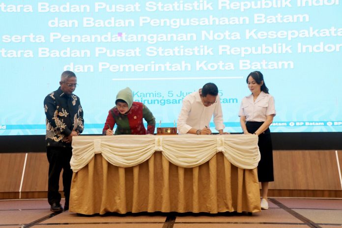 BATAMSTRAITS.COM, BATAM – Wali Kota Batam sekaligus Kepala Badan Pengusahaan (BP) Batam, Amsakar Achmad, menandatangani Nota Kesepahaman (MoU) antara Badan Pusat Statistik (BPS) Republik Indonesia dengan Badan Pengusahaan (BP) Batam, serta Nota Kesepakatan antara Badan Pusat Statistik (BPS) Republik Indonesia dengan Pemerintah Kota Batam yang berlangsung di Balairungsari, Lantai 3 Gedung Bida Utama, BP Batam, Kamis (5/6/2025).